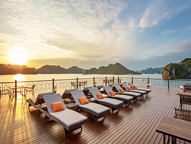 下龍灣的Indochine Premium Cruise頂級郵輪擁有37間豪華客艙,每間客艙均設有私人陽台和落地窗,讓您在航行中無時無刻欣賞壯麗的下龍灣美景。船上設施一應俱全,包括迷你高爾夫球場、游泳池、Sundeck酒吧、高級餐廳和水療室,更不容錯過的是獨一無二的300平方米超大Sky Lounge,360度視野欣賞下龍灣海域,為您的旅程增添了無限魅力。