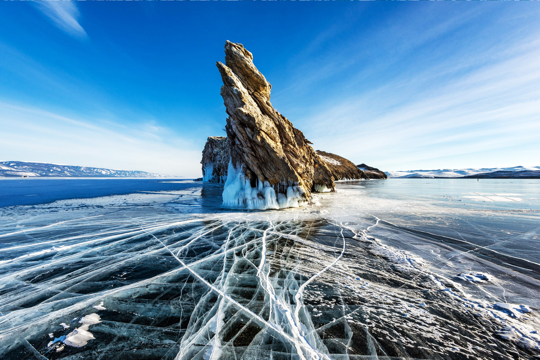 每年只有幾個星期,貝加爾湖神秘地變身成一面光滑的剔透明鏡,與雄偉山脈接壤與湛藍天色倒映。貝加爾湖的藍冰宛如令人難以置信的神話是旅人及探險家追逐目標,一個由偉大的藝術家─大自然所創造的奇妙景觀。腳下踩著純淨看似薄透卻深得見底的湖面,自然冰凍凝結而成的奇異圖案。