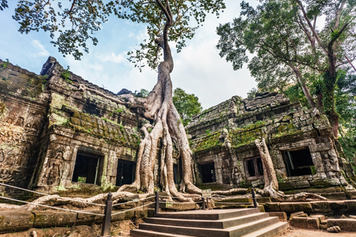 【塔普倫神廟TaProhm Temple】建於12世紀末,百年老樹與巨石盤結而成,樹根向四面八方蓬勃發展,盤根錯節如巨蟒般緊緊纏繞著佛塔及廟牆,蔚為奇觀!您可體驗「敲心殿」拍掉煩惱的奧妙建築,證明古高棉的智慧是如此之高!此處即為古墓奇兵中,傳說光的魔三角之所在地,讓您讚嘆大自然神奇的力量!