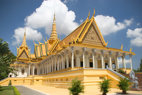 金邊皇宮述說著高棉過往輝煌的歷史,其金碧輝煌的外觀混合高棉建築特色及法式殖民主義色彩。