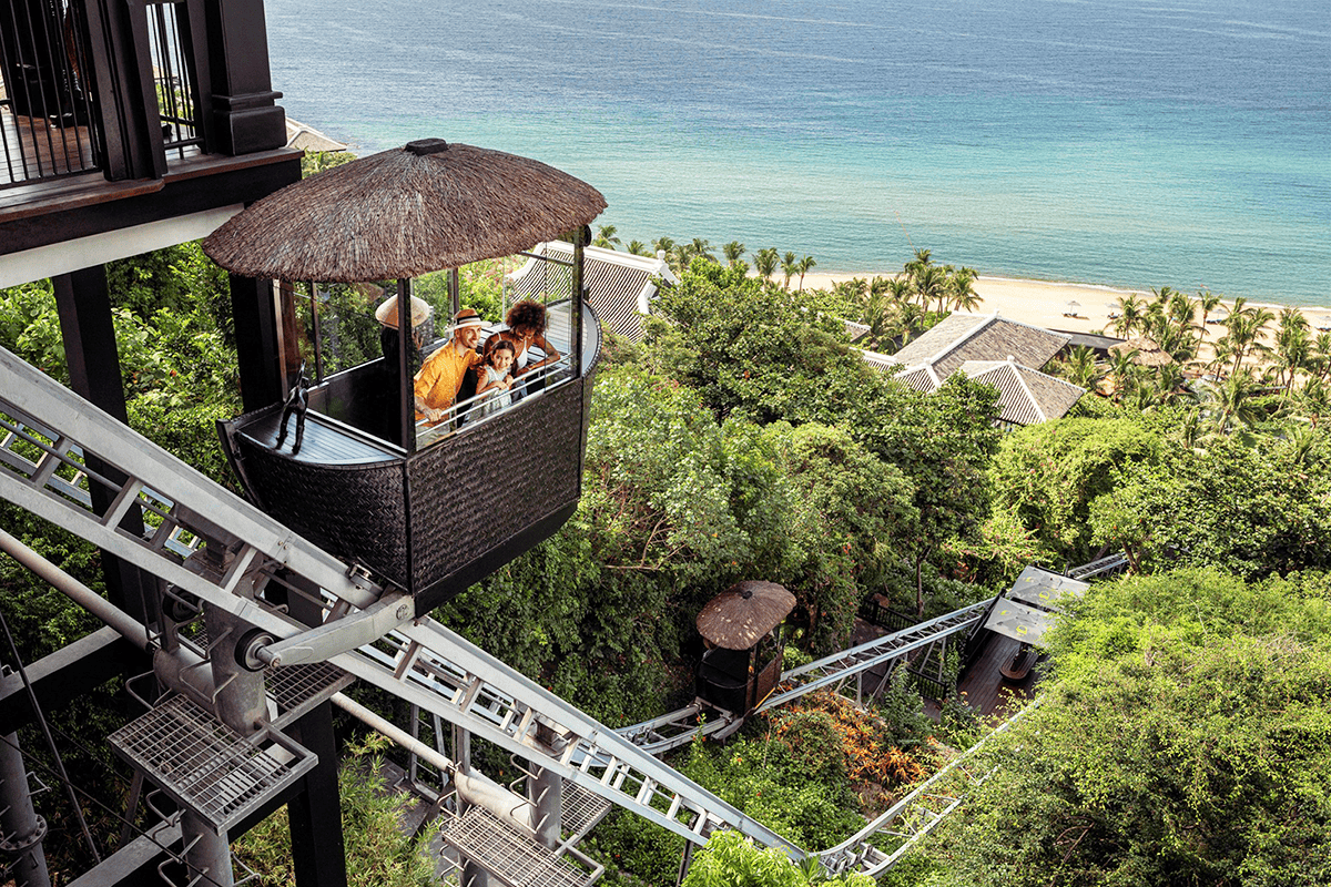 園區規劃為「大海、地面、天空、天堂」四大區域,旅人可搭乘仿越南竹籃船造型纜車穿梭其間,沿途俯瞰原始雨林與碧海風光,享受獨特空中旅程。