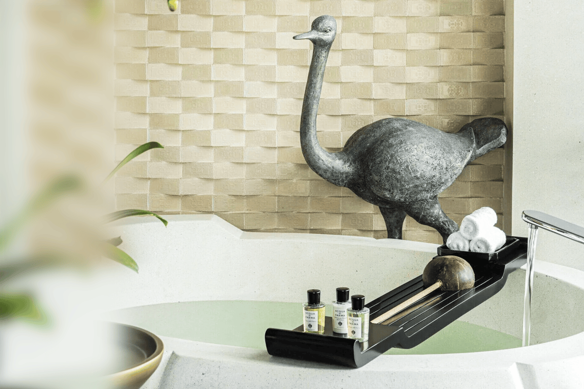 酒店擁有201間精心設計的客房。無論是坐擁壯麗視野的頂層公寓,還是通往海灘的海濱別墅,每間房間都將舒適與美學完美結合。立於陽台,眼前是大海與天空相連的瑰麗景緻;走進房內,從傢俱挑選到陳設擺放,處處映照出設計師的用心與品味。