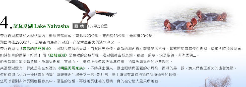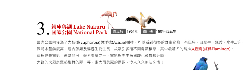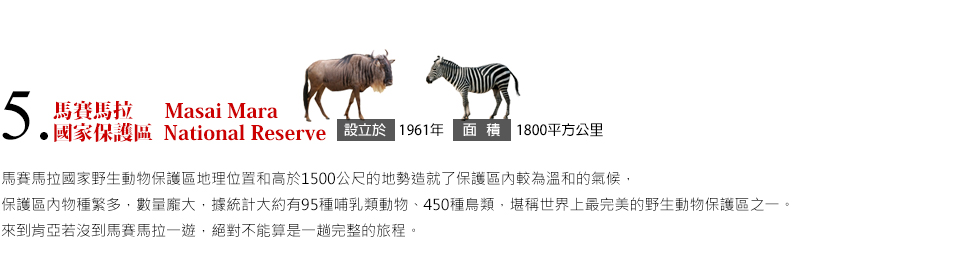 喜愛動物及鳥類的您,不甘於只是坐在電視機前面欣賞 Discovery,更想身歷其境,近距離欣賞非洲五霸(獅、非洲象、非洲水牛、豹和黑犀牛)及其他可愛動物,肯亞會是您絕佳的旅遊地。 
