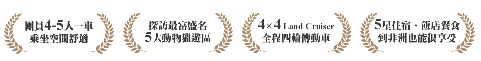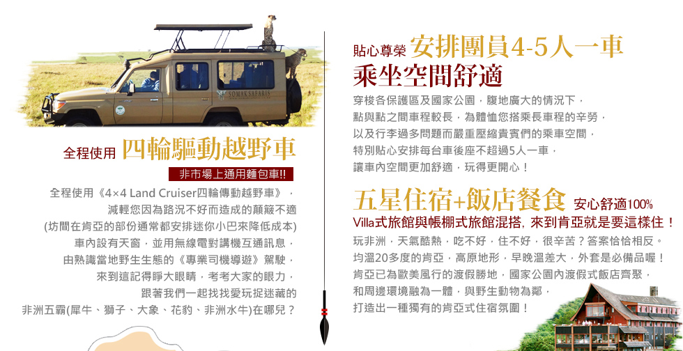 02) 全程使用4×4掀頂式Land Cruiser,車身較高,讓您在觀察或拍照時有更佳的視野角度,且對地形克服能力較佳,吉普車(每車後座保證不超過5位乘客,讓您坐得舒適!!)